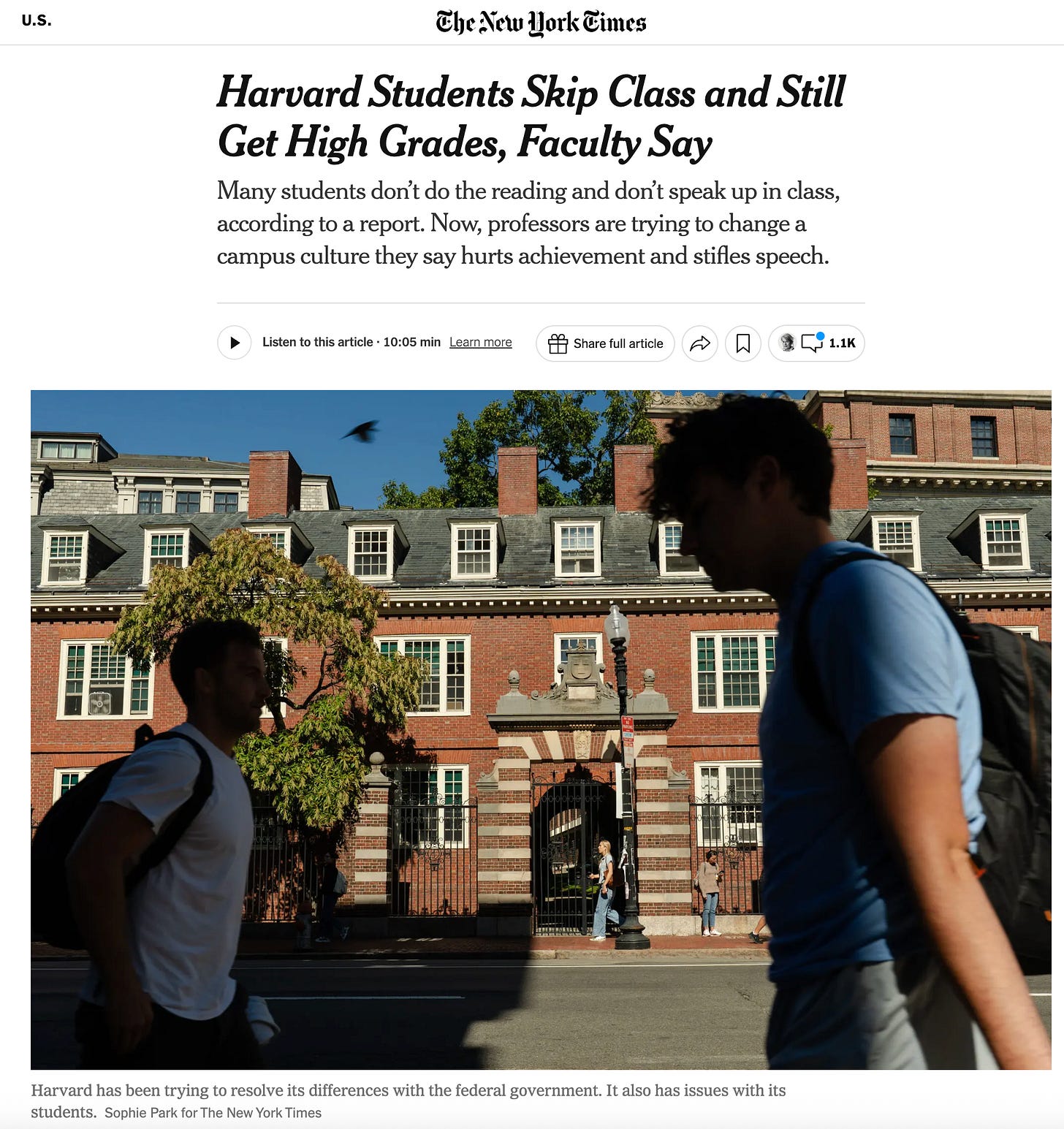 According to a recent New York Times Article, summing up a report written by seven of its own faculty, “…many [Harvard] students skip class and fail to do the reading.”